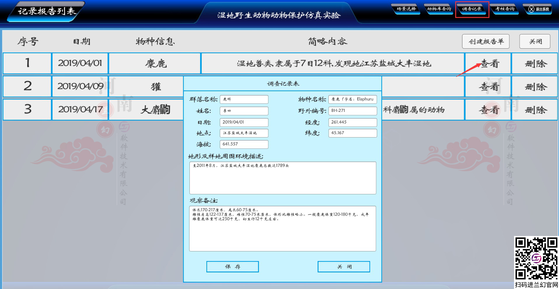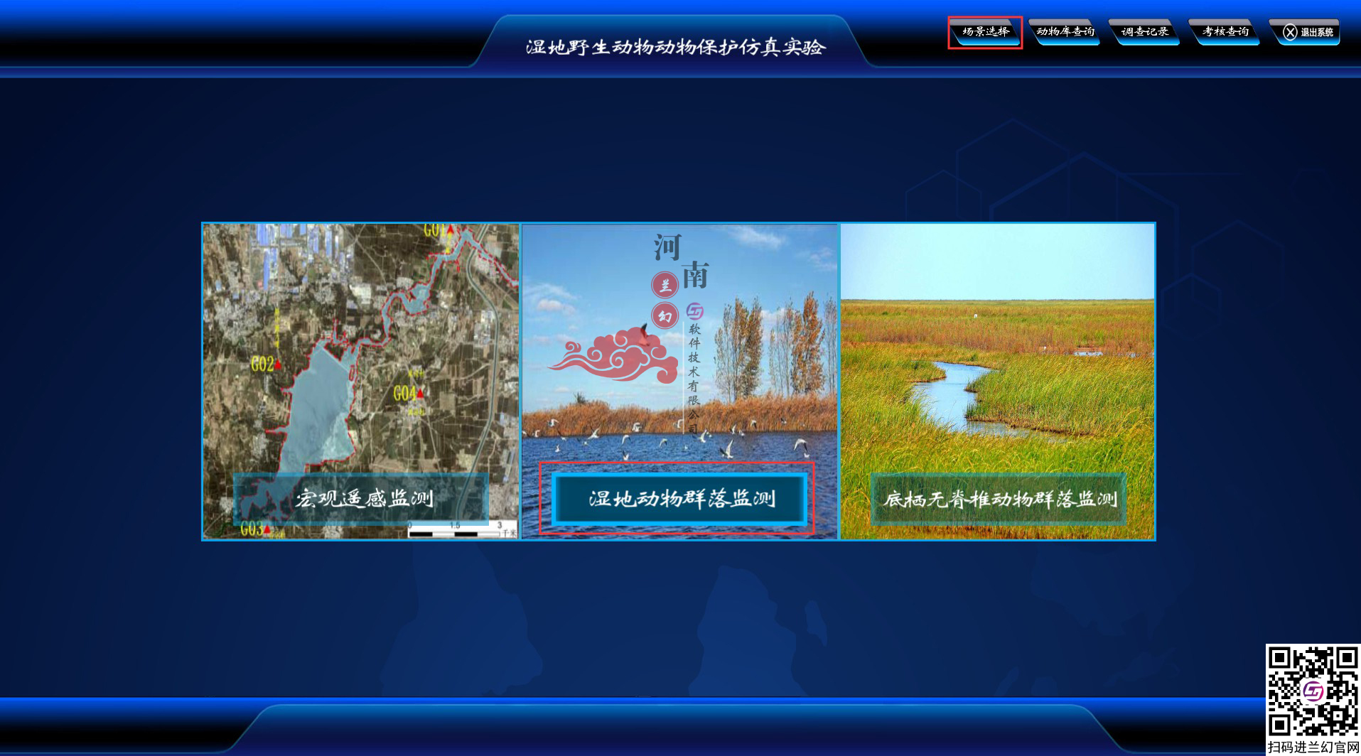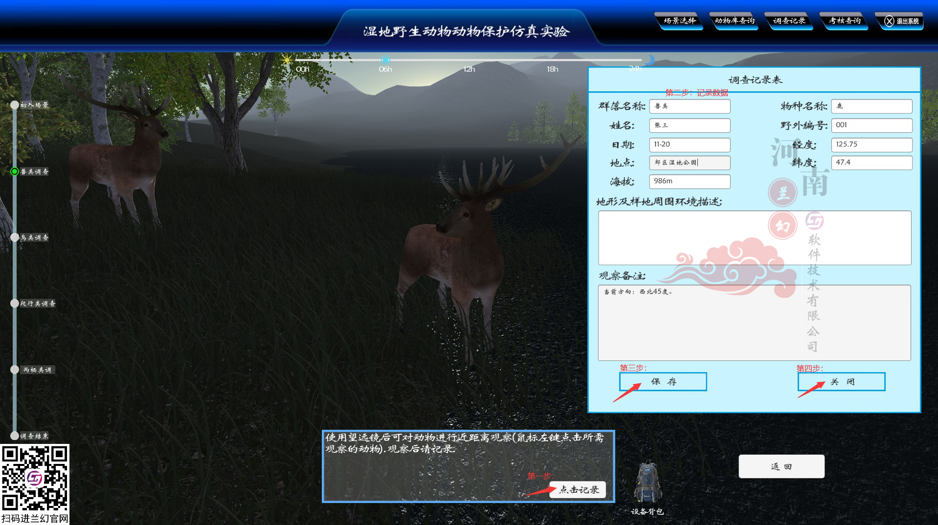 野生動(dòng)物動(dòng)物保護(hù)仿真實(shí)訓(xùn)軟件利用虛擬環(huán)境方法,采用樣線法、樣方法學(xué)習(xí)植物種類,種類、生長(zhǎng)地、生活型、頻度、高度、蓋度等特征,分析濕地植物結(jié)構(gòu)變化,了解植物發(fā)育規(guī)律利用虛擬環(huán)境樣,對(duì)環(huán)境脊椎動(dòng)物、無脊椎動(dòng)物樣線法、樣點(diǎn)法和直接計(jì)數(shù)法進(jìn)行調(diào)查,對(duì)集群繁殖或棲息的鳥類調(diào)查使用直接計(jì)數(shù)法進(jìn)行調(diào)查,記錄動(dòng)物或活動(dòng)痕跡所在地的坐標(biāo)、地貌、海拔、坡度、坡位、坡向、植被類型等棲息地因子,了解動(dòng)物的生活史,以及各調(diào)查樣區(qū)野生動(dòng)物及棲息地受到的主要威脅、受干擾狀況及程度。