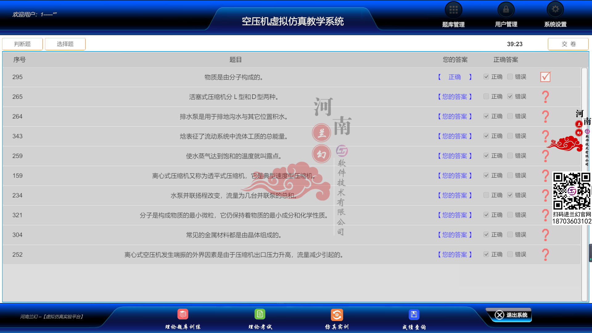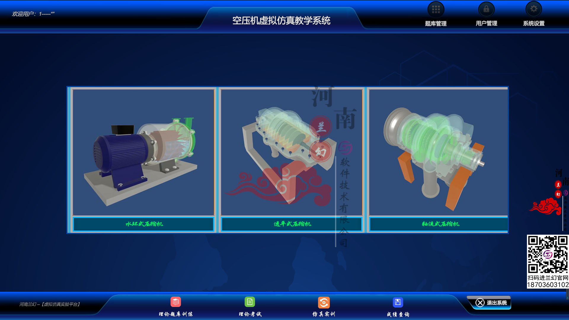 同樣教師也可以利用空壓機虛擬仿真實訓教學系統對學生的知識水平和自己的教學進度有一個全面的掌握。教師可以從以下幾個方面對學生的學習情況進行了解。1.教師可以根據需要通過空壓機虛擬仿真實訓教學系統來增加題庫的題目,在學生們進行課堂練習時了解學生的理論知識的掌握程度。2.空壓機虛擬仿真實訓教學系統設置有考試系統。教師可以根據在考試系統里自由設置題目的數量以及成績分值的權重,教師也可以通過查看學生考試情況對學生有個更全面的了解。3.教師可以在實操中利用虛擬技術為學生重復操作器材,這樣不僅可以讓學生對儀器有個更加深入的了解同時也能極大的降低儀器的使用耗損,延長儀器的使用壽命。4.教師同樣也可以通過虛擬仿真教學系統自帶的用戶管理系統對每臺電腦上的學生登錄情況進行系統的了解,從而極大程度避免了一些意外的發生。