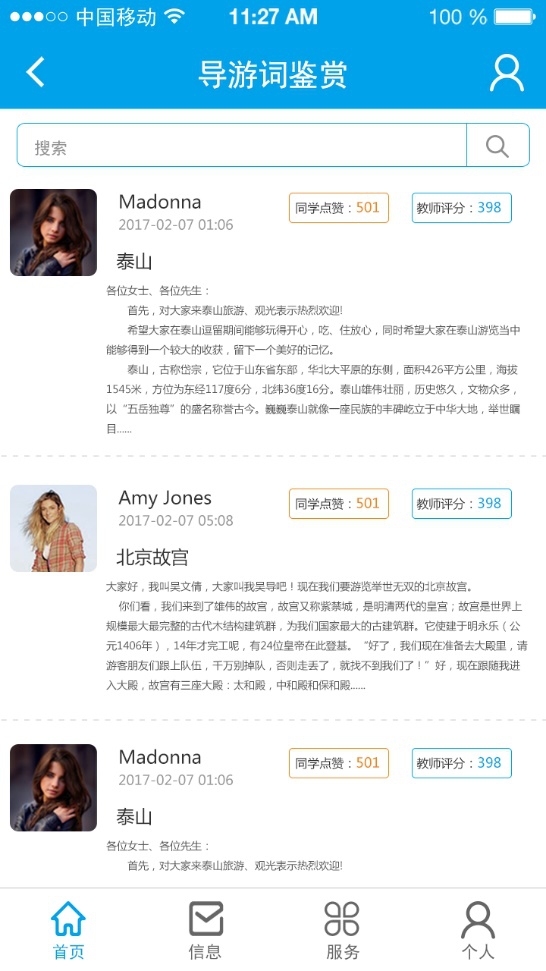 學(xué)生在國內(nèi)外著名景點模塊中,可以極大的擴大眼界,跟貼近的了解景點的各方各面,包括景點的介紹、圖片、風(fēng)貌、視頻等等。